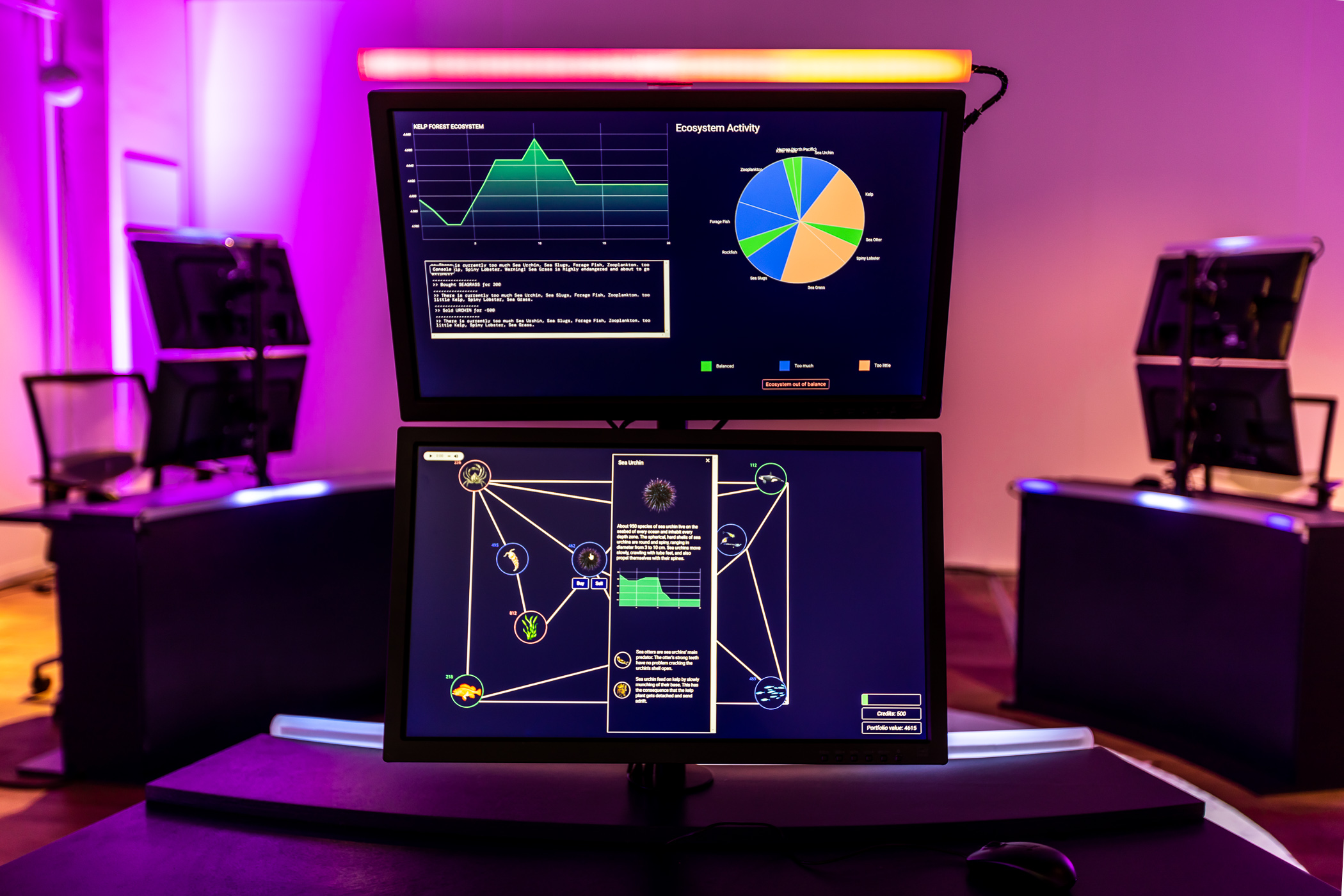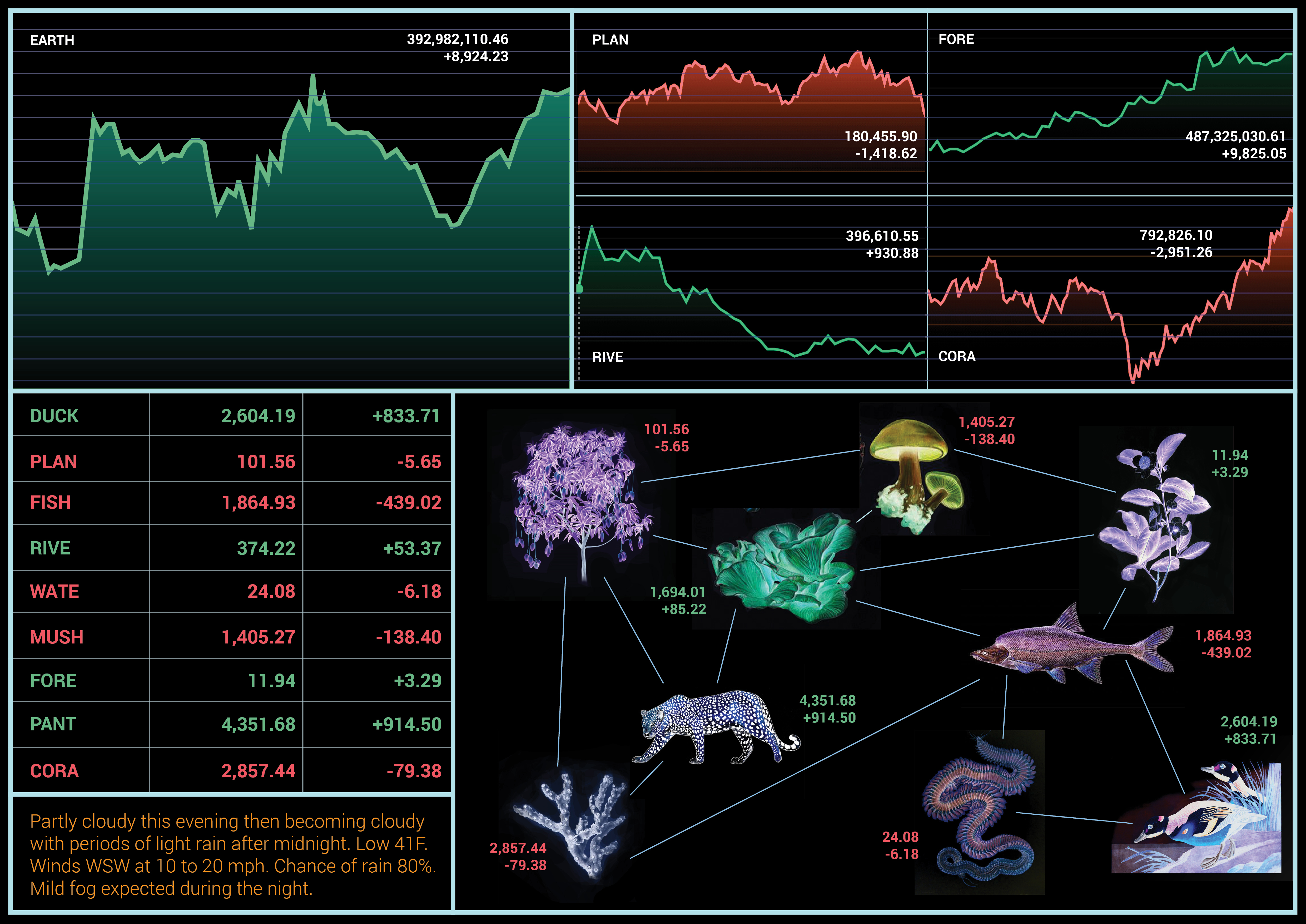 In this alternative stock market, visitors invest in species instead of in companies. Each of these actions feeds into the simulation, causing the chosen species to thrive. Graphs and line charts are giving hints in real time about investment opportunities – of stocks that may be undervalued or overvalued. Which species or geographic regions need a financial boost? Investors also receive profit distributions: the better an ecosystem performs, the higher the profit. This exchange (or entanglement) makes investors literally “invested” in the well-being of sea otters, fungi and kelp forests.