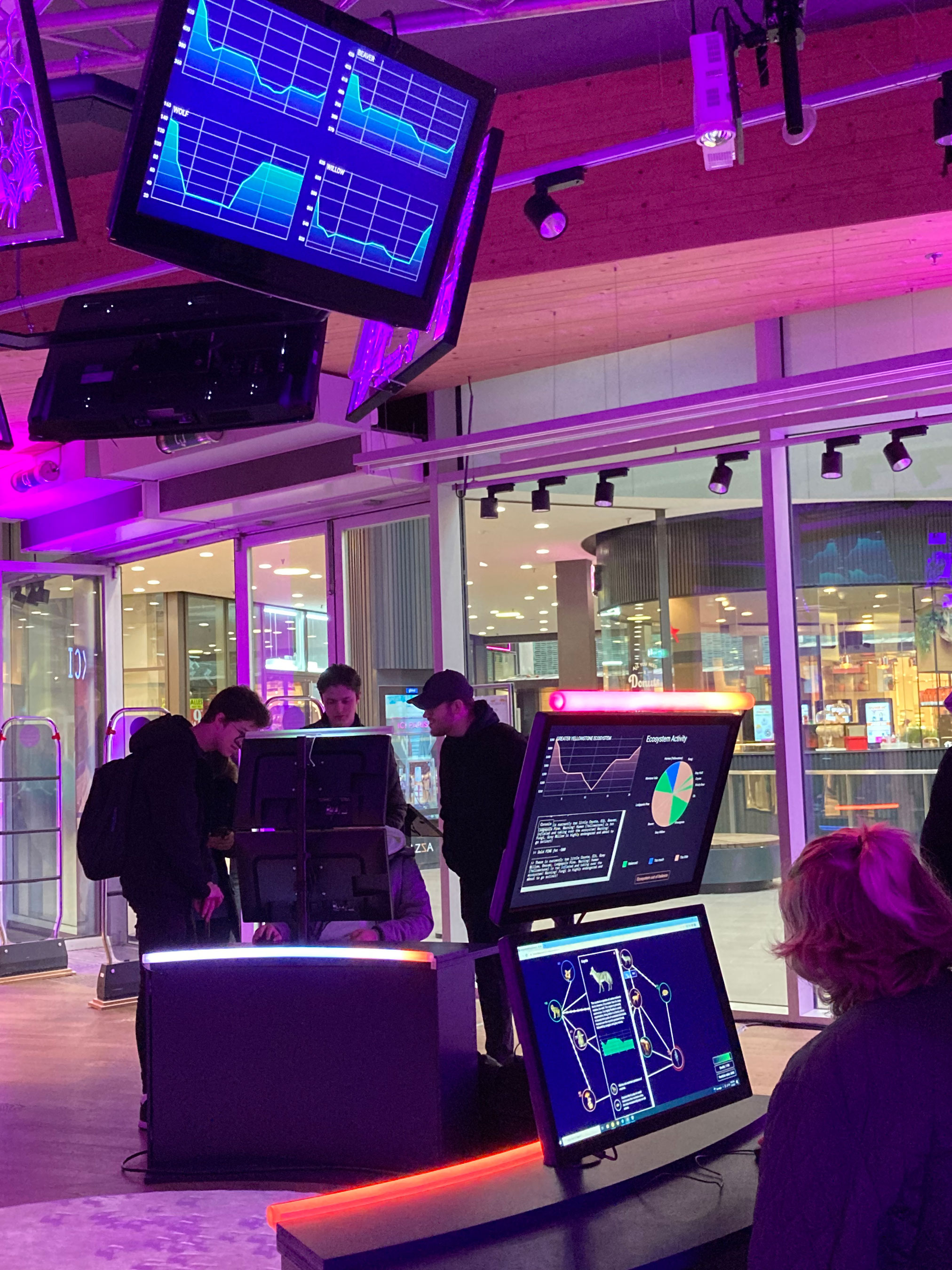 In its spatial design, ESX fuses a dynamic arcade (with guiding, animated light bars) with the seriousness of a stock exchange (with its monitor circles hovering on top displaying raw information and switching numbers from all around the world). The exhibition design is complemented with neonglow illustrations of each of the three ecosystems that can be played (savanna, pacific ocean, greater yellowstone). A circular projection in the centre shows moving landscapes from an aloof view, depicting the three ecosystems as animate assets, aerial shots of eco-data.